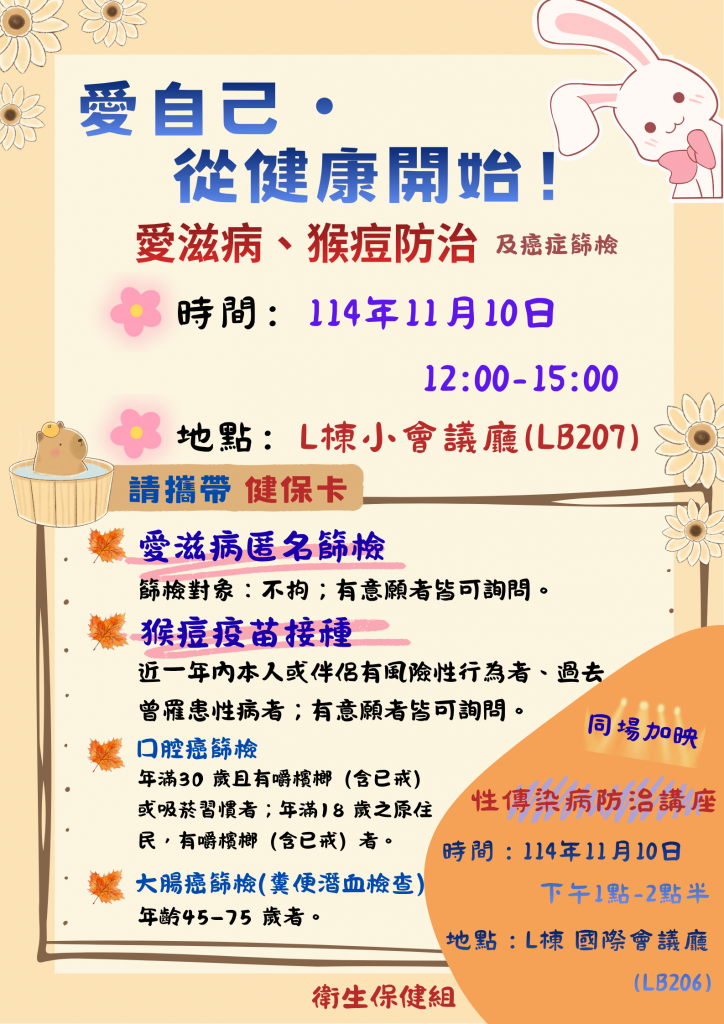 【衛保組活動公告】性傳染病防治活動(愛滋匿名篩檢、猴痘疫苗接種),歡迎有興趣之教職員工生現場諮詢,由台中榮總團隊為您服務。